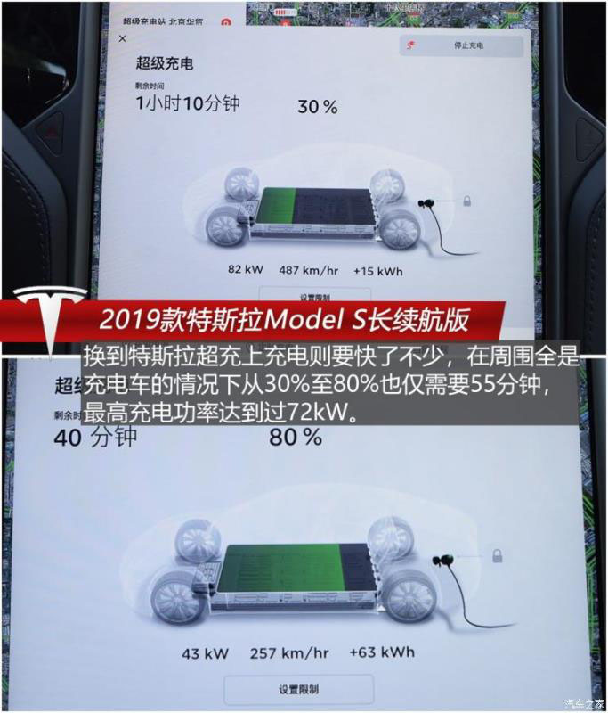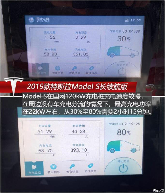 之后我們?cè)趪?guó)網(wǎng)直流120kW充電樁為Model S充電,不過在充電過程中我們發(fā)現(xiàn)這臺(tái)車與國(guó)網(wǎng)直流充電樁兼容性較差,充電速度遠(yuǎn)低于在超級(jí)充電樁充電的速度,在周邊沒有什么車充電分流的情況下,最高充電功率也僅有22kW左右,從30%至80%需要2小時(shí)15分鐘,而且在兩處距離甚遠(yuǎn)的國(guó)網(wǎng)充電站充電速度都差不多;換到特斯拉超充則要快了不少,在周圍全是充電車的情況下從30%至80%也僅需要55分鐘,最高充電功率達(dá)到過72kW。