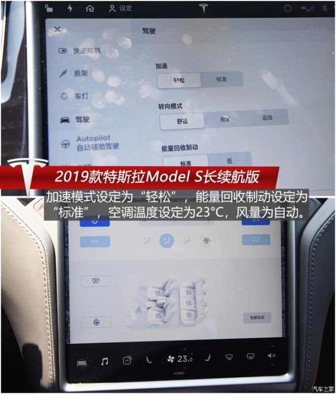 Model S的舒適性還體現(xiàn)在能量回收的設(shè)定上,同樣是兩擋設(shè)定,“低”擋位下松開加速踏板并不會(huì)有明顯的拖拽感,動(dòng)能回收力度柔和細(xì)膩;“標(biāo)準(zhǔn)”模式下拖拽感及減速效果會(huì)更強(qiáng),但也在可接受范圍內(nèi),不至于讓人有不適之感。