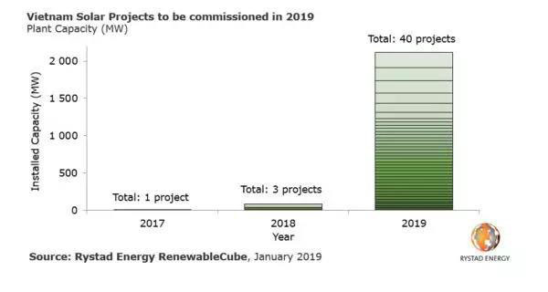 Rystad Energy的分析師認(rèn)為,越南的新增裝機(jī)量出人意料,幾乎沒有人想到越南的新增大型地面裝機(jī)量會(huì)在2019上半年就超過澳大利亞。預(yù)計(jì)2019年下半年澳大利亞將再上線800MW太陽能電力,但盡管如此,全年3.5GW的新增量仍將低于越南。