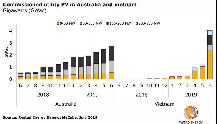 據(jù)越通社報(bào)道,截至6月30日,越南并網(wǎng)光伏項(xiàng)目累計(jì)4312兆瓦,而截止2019年4月,越南僅有150MW項(xiàng)目并網(wǎng)。經(jīng)此一戰(zhàn),越南在全年新增光伏裝機(jī)量上有超過穩(wěn)定增長(zhǎng)的澳大利亞的跡象。