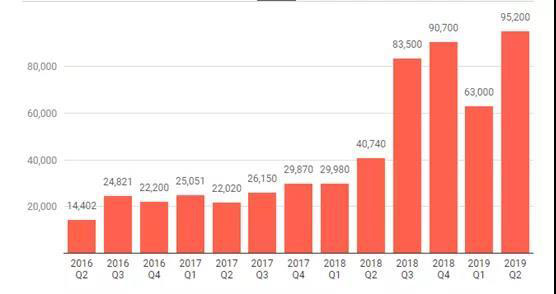 今年前3個月,特斯拉交付50,900輛Model3和12,100輛ModelS和ModelX,即共計63000輛,第二季與之相比增幅達51.1%。下圖是自2016年第二季度以來,特斯拉每一季度的交付情況:
