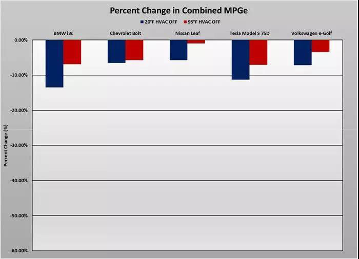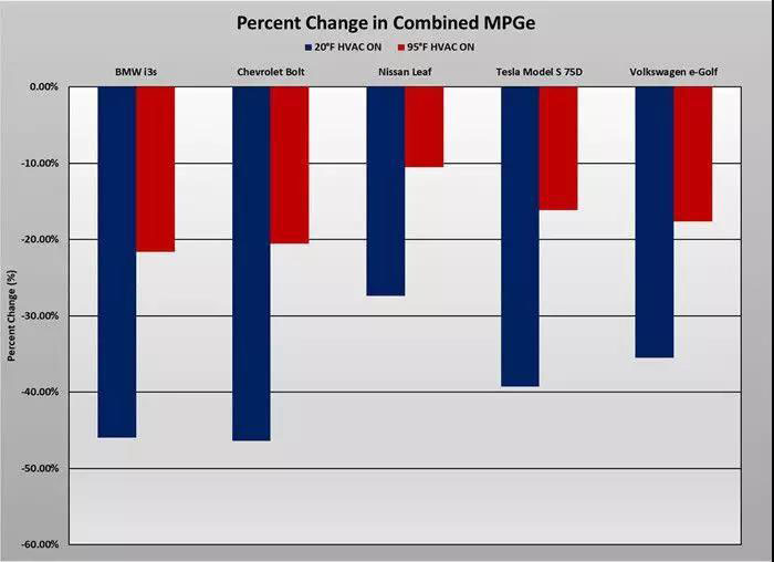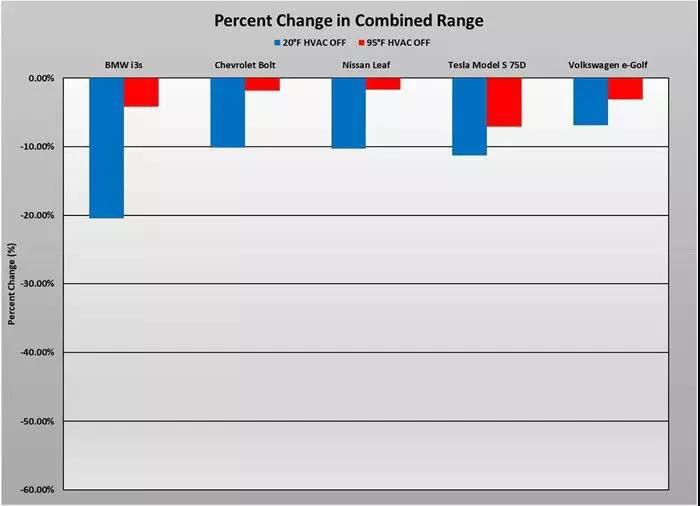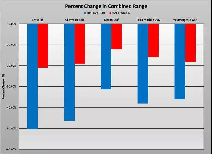 「我們發(fā)現(xiàn)溫度對(duì)于電動(dòng)汽車的影響遠(yuǎn)遠(yuǎn)超出我們的預(yù)期,」AAA 汽車工程總監(jiān) Greg Brannon 說,「對(duì)于所有計(jì)劃部署推出電動(dòng)汽車的制造商來說,這是他們必須要處理的事情?!笰AA 總共測(cè)試了 BMW i3,雪佛蘭 Bolt EV,日產(chǎn) Leaf,特斯拉 Model S 和大眾電動(dòng)高爾夫這五款來自不同品牌的電動(dòng)車型。AAA 的工程師對(duì)每輛車分別進(jìn)行了 20°F(約零下 6.7°C)以及 95°F(35°C)的環(huán)境下的測(cè)試。