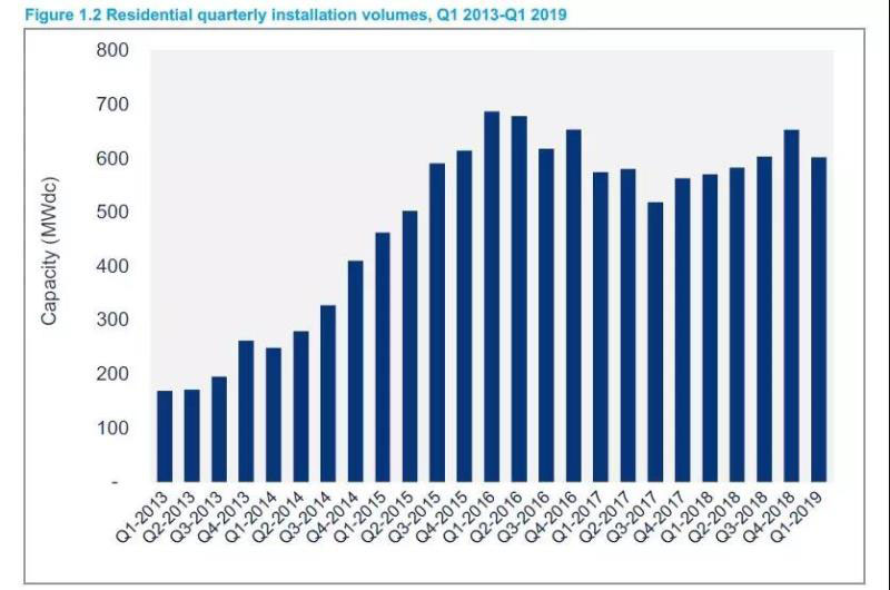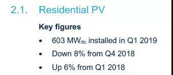 5、住宅市場(chǎng)有繼續(xù)反彈的表現(xiàn)。 自2017年住宅市場(chǎng)隨著SolarCity(現(xiàn)為特斯拉)陷入困境被收購(gòu)又激進(jìn)增長(zhǎng)疲軟后,屋頂太陽(yáng)能市場(chǎng)目前趨于穩(wěn)定——第一季度新增603MW,同比增長(zhǎng)6%。