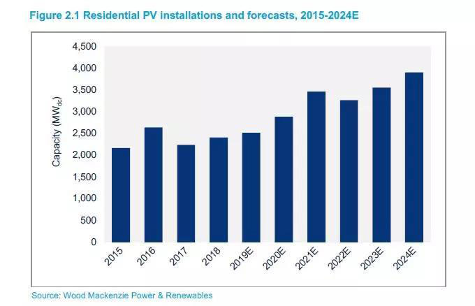 6、加利福尼亞和東北部等市場(chǎng)的疲弱增長(zhǎng)正被許多“新興”市場(chǎng)(包括佛羅里達(dá)州和德克薩斯州)的強(qiáng)勁增長(zhǎng)力所抵消。第一季度近三分之一的新住宅裝機(jī)量來(lái)自10名開(kāi)外的新興市場(chǎng),是有史以來(lái)新興市場(chǎng)份額占比最高的年份。預(yù)測(cè)2019 - 2021年間屋頂太陽(yáng)能市場(chǎng)的增長(zhǎng)率為5%至20%,其中迭加了馬里蘭州的可再生能源組合標(biāo)準(zhǔn)增加,南卡羅來(lái)納州的凈計(jì)量上限和伊利諾伊州的可調(diào)整塊計(jì)劃等新推動(dòng)因素。加州的家庭太陽(yáng)能任務(wù)將從2020年開(kāi)始為屋頂市場(chǎng)助力。