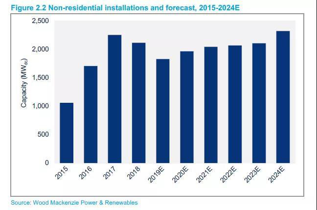 7、與不斷增長(zhǎng)的公用事業(yè)級(jí)項(xiàng)目和住宅屋頂市場(chǎng)形成鮮明對(duì)比的是,工商業(yè)屋頂項(xiàng)目表現(xiàn)低迷,第一季度實(shí)現(xiàn)了438MW,比去年下降了18%。WoodMac預(yù)計(jì)隨著社區(qū)太陽(yáng)能項(xiàng)目在紐約、伊利諾伊、馬里蘭和新澤西等州的起飛,未來(lái)幾年非住宅市場(chǎng)將出現(xiàn)適度反彈。