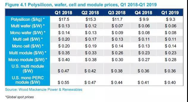 在所有組件中,2019年第一季度只有多晶硅價(jià)格下跌。硅片,多晶電池和多晶組件的現(xiàn)貨價(jià)格沒(méi)有變化。