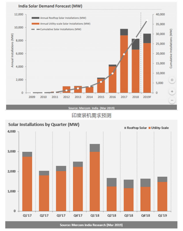 ·Mercom預(yù)測(cè)印度將在2019年(CY)新增9GW光伏裝機(jī)量。到2022年底,印度的太陽(yáng)能裝機(jī)量將達(dá)到71GW,比政府設(shè)定的100GW目標(biāo)低近30%,但相信通過(guò)政府積極的推動(dòng)和支持政策,目標(biāo)仍然是可以實(shí)現(xiàn)的。