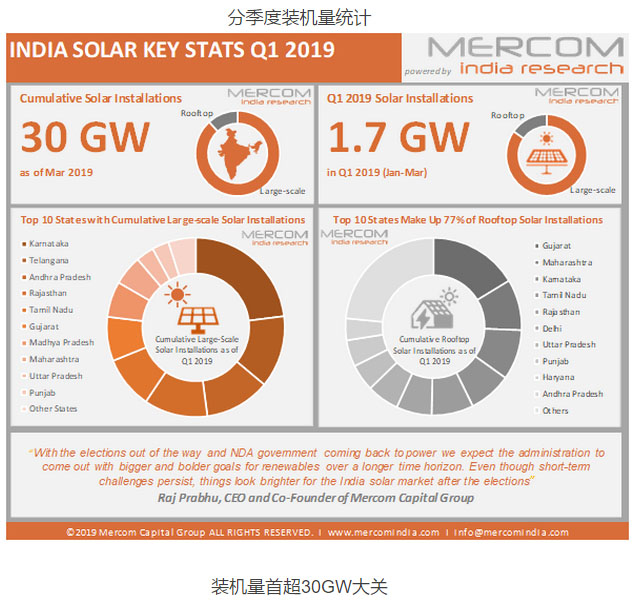 ·印度的太陽(yáng)能裝機(jī)量在2019年第一季度末超過(guò)了30GW里程碑,其中屋頂太陽(yáng)能項(xiàng)目超過(guò)3.5GW,仍然只占太陽(yáng)能裝機(jī)總量的12%,距離到2022年屋頂光伏裝機(jī)量達(dá)到40GW的目標(biāo)僅實(shí)現(xiàn)了9%。