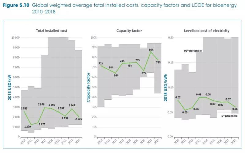 國際可再生能源署發(fā)布最新的可再生能源發(fā)電成本報告,2010-2018年全球生物質(zhì)發(fā)電項目加權(quán)平均的單位投資成本、容量系數(shù)、平準化成本走勢如下(以2018年美元計):