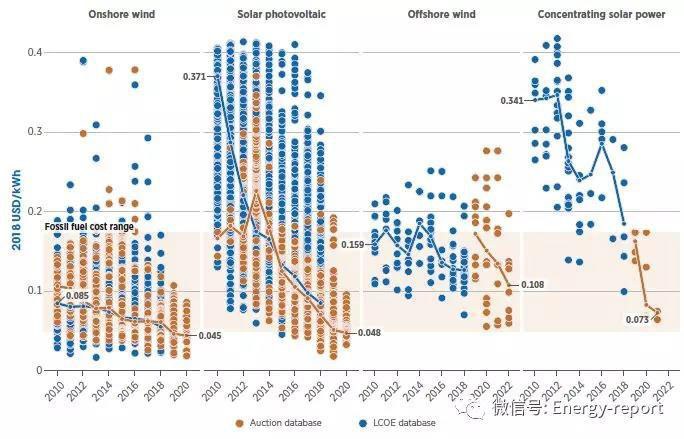 在當(dāng)今世界大部分地區(qū),可再生能源已成為成本最低的電力來(lái)源。隨著太陽(yáng)能和風(fēng)能技術(shù)成本的持續(xù)下降,更多的國(guó)家將會(huì)出現(xiàn)這種情況。2010~2018年,生物質(zhì)能、水電、地?zé)?、陸上和海上風(fēng)電的成本降至化石燃料發(fā)電成本以下,光伏發(fā)電是從2014年開始,全球加權(quán)平均電力成本下降到化石燃料發(fā)電成本以下。