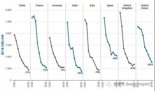 2010~2018年,選定國(guó)家的太陽(yáng)能光伏總安裝成本趨勢(shì)