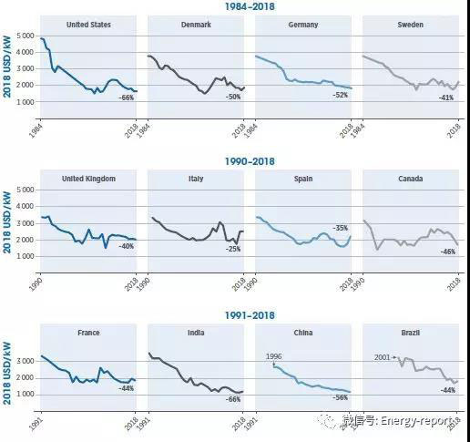 1984~2018年12個(gè)國(guó)家的陸上風(fēng)電加權(quán)平均安裝成本
