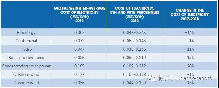 2018年,所有商用可再生能源發(fā)電技術(shù)的全球加權(quán)平均電力成本下降。2018年,光熱發(fā)電的電力成本同比下降26%,其次是生物質(zhì)能(下降14%)、光伏發(fā)電和陸上風(fēng)電(均下降13%)、水電(下降11%)、地?zé)岷徒#ㄏ陆?%)。個(gè)人無(wú)補(bǔ)貼生物質(zhì)能、水電、陸上風(fēng)電和光伏發(fā)電削弱化石燃料發(fā)電將越來(lái)越普遍。