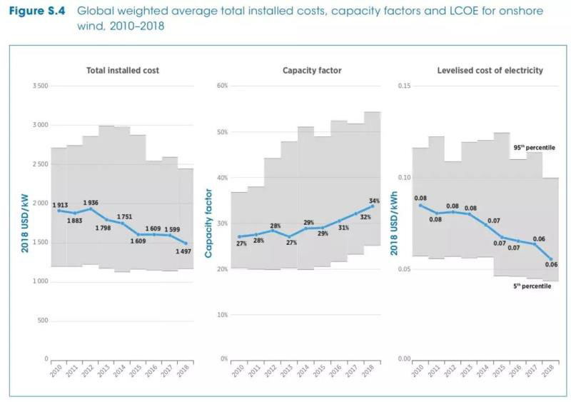 國(guó)際可再生能源署發(fā)布最新的可再生能源發(fā)電成本報(bào)告,2010-2018年全球陸上風(fēng)電項(xiàng)目加權(quán)平均的單位投資成本、容量系數(shù)、平準(zhǔn)化成本走勢(shì)如下(以2018年美元計(jì)):