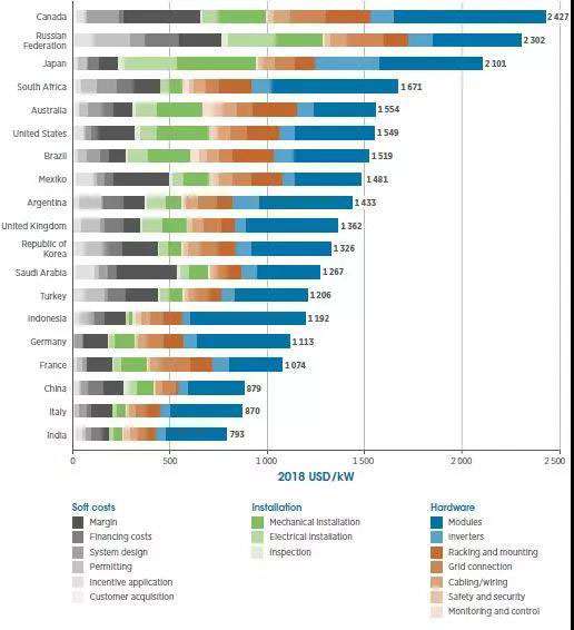 上圖為G20國家中各國發(fā)展集中式光伏的成本明細,中國的光伏成本為全球第三低,同印度、意大利相比,我國在系統(tǒng)設(shè)計、金融成本(比如融資成本)、并網(wǎng)等方面仍有一定的進步空間。