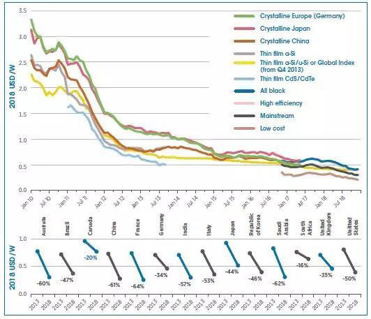 上圖的上半部分為2018年1月到7月的光伏制造業(yè)不同環(huán)節(jié)、不同生產(chǎn)地的成本??梢钥吹剑夥煌h(huán)節(jié)的成本在短短的半年中均出現(xiàn)了一定程度的下降。下部分為2013到2018年全球主要發(fā)展光伏的國家光伏組件的成本下降程度。