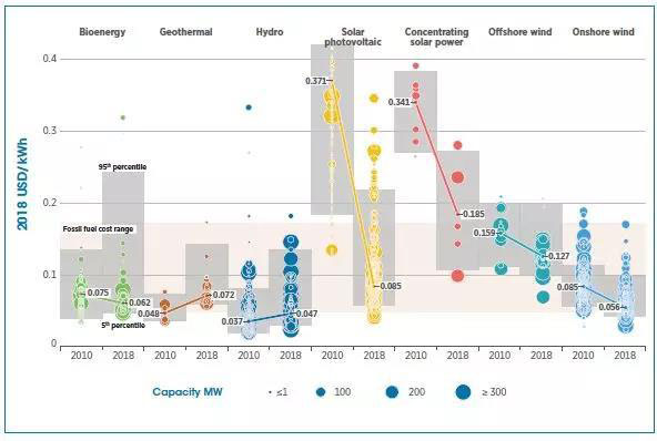 下圖把全球可再生能源2010年到2018年的平均平準化成本可視化了,粉色區(qū)域為低于最便宜的化石能源發(fā)電的成本區(qū)間。可以看到,經(jīng)過八年的發(fā)展,除了太陽能光熱略高于化石能源的最低成本外,其他類型的可再生能源的全球平均平準化成本已經(jīng)比可再生能源低。