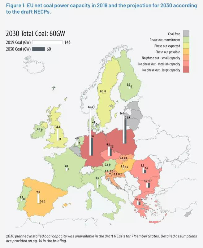 根據(jù)英國Sandbag機(jī)構(gòu)匯總的數(shù)據(jù),歐盟國家中有21個(gè)國家有煤電,總裝機(jī)容量為143吉瓦。目前有8個(gè)歐盟成員國明確承諾在國家能源和氣候計(jì)劃(NECP,2021-2030)期間明確承諾逐步淘汰煤炭;2個(gè)成員國將淘汰煤炭,但沒有在NECP中明確規(guī)定;11個(gè)成員國沒有到2030年淘汰煤炭的計(jì)劃,其中一些煤炭產(chǎn)能與2019年相比幾乎沒有減產(chǎn)。到2030年,歐盟國家煤電裝機(jī)僅剩60吉瓦,主要集中在6個(gè)成員國:波蘭,德國,捷克,保加利亞,羅馬尼亞和希臘。