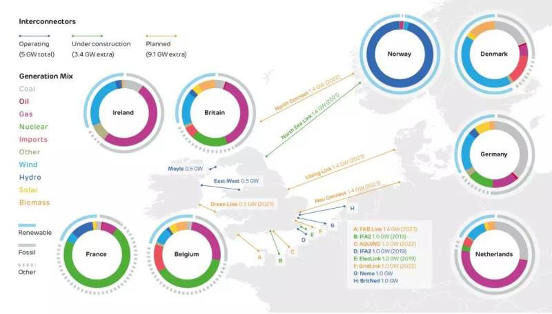 目前在建的聯(lián)網(wǎng)項目規(guī)模達到2.4吉瓦,包括法-英Eleclink項目(1吉瓦,2019投運)、法-英IFA2(1吉瓦,2019投運)、挪威-英North Sea Link(1.4吉瓦,2021年投運)。此外還有9.1吉瓦聯(lián)網(wǎng)項目在規(guī)劃中。