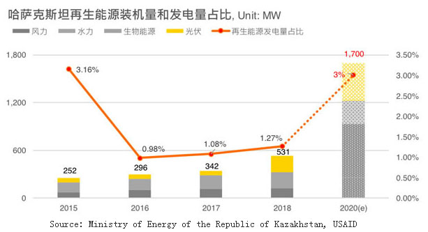 哈薩克斯坦的能源需求大部分來自于燃煤發(fā)電,近年政府積極推動綠電發(fā)展致力實現(xiàn)2020年發(fā)電量目標(biāo),截至2018年年底,再生能源的發(fā)電量占比已達到1.27%,和2017年相比些微成長0.19%。