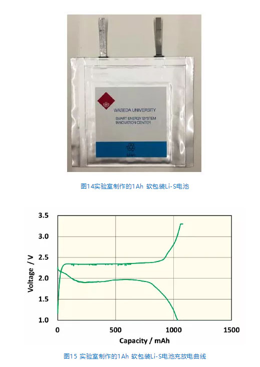 圖14 是實(shí)驗(yàn)室制作的1 Ah 軟包裝Li-S電池,其中硫載量為17.5 mg/cm2。該鋰硫電池由1 mm 厚硫正極和0.2 mm 厚鋰負(fù)極組成,5 Ah 鋰硫電池可通過(guò)堆疊幾片這樣的單體電池獲得。圖15 是該電池充放電曲線。