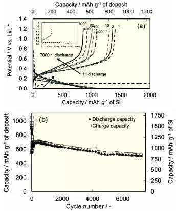 對(duì)實(shí)驗(yàn)制得的Si-O-C負(fù)極進(jìn)行充放電實(shí)驗(yàn),充放電效率達(dá)到98%——99%,放電比容量830 mAh/g,可實(shí)現(xiàn)超過(guò)7 000 次循環(huán)。充放電曲線見(jiàn)圖9。