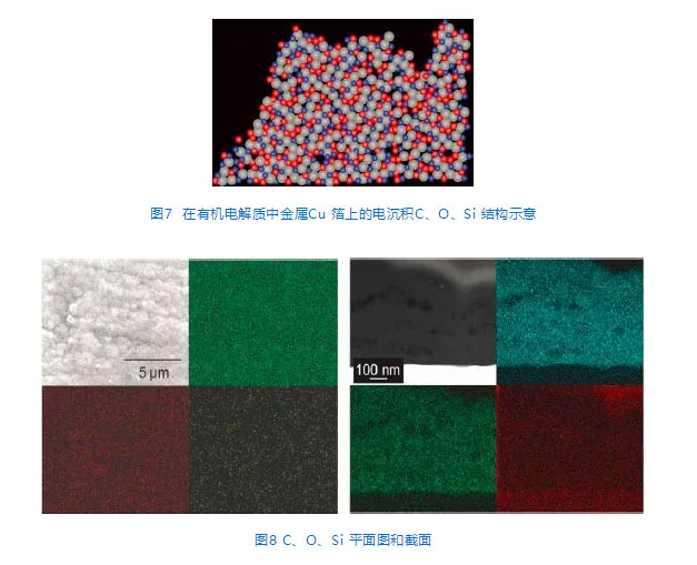 在有機(jī)電解液中電沉積制備負(fù)極示意圖見(jiàn)圖7。用碳酸丙二酯和四氯化硅作溶劑,硅沉積和溶劑分解同時(shí)出現(xiàn),硅和有機(jī)/ 無(wú)機(jī)化合物的微復(fù)合,沉積的硅化合物平面圖和截面見(jiàn)圖8,在圖中發(fā)現(xiàn)Si、O、C 在沉積層中均勻分布。