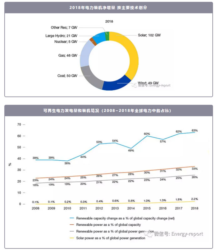 盡管光伏同比增長較低,僅為個位數(shù),但它再次成為2018年全球裝機增幅最大的發(fā)電技術(shù)。部署的太陽能光伏裝機比任何其他單一技術(shù)都多。事實上,2018年太陽能光伏裝機的凈增量是當(dāng)年煤電和風(fēng)電裝機凈增量的兩倍還要多。與前一年一樣,2018年太陽能光伏裝機比所有化石燃料和核電的新增裝機總量都要高,盡管領(lǐng)先得并不多(不到1%)。與化石燃料發(fā)電裝機相比,太陽能光伏的新增裝機似乎令人印象深刻,但事實是,太陽能要挖掘其巨大的潛力還有很長的路要走—它在2018年全球發(fā)電量中的占比很小,僅為2%。