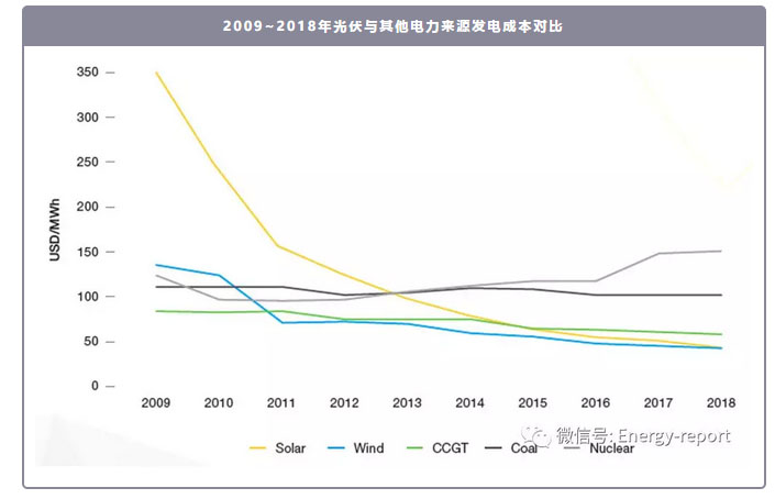 2009~2018年光伏與其他電力來源發(fā)電成本對比