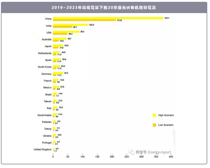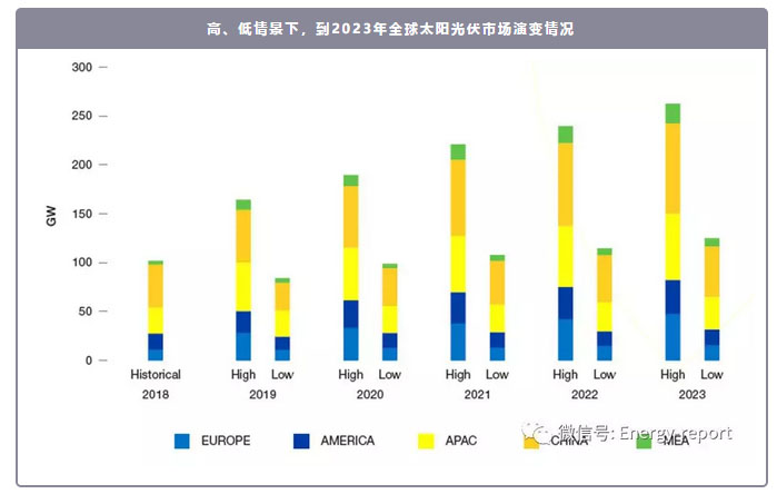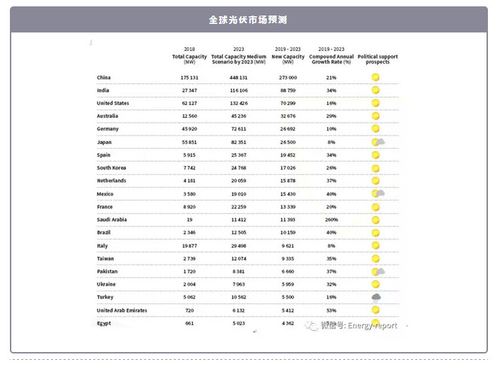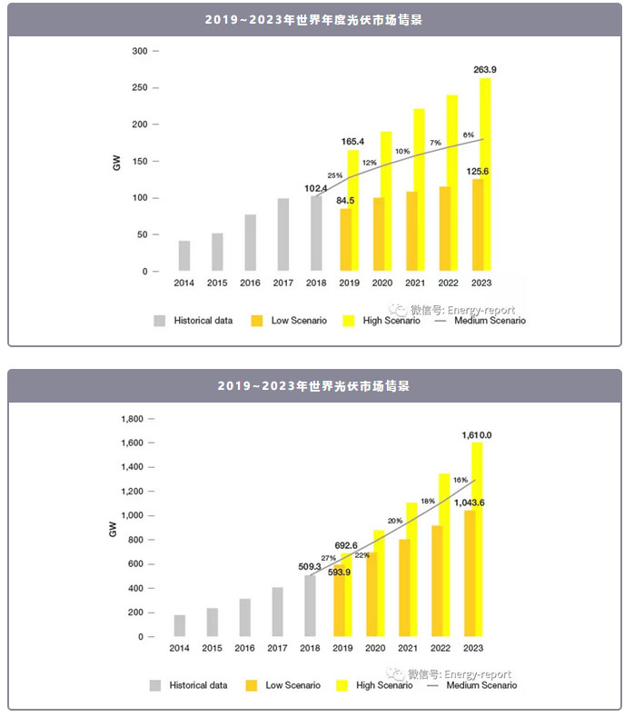 與往年一樣,《2019年全球市場展望》的情景顯示,與去年的《全球市場展望》版本相比,增長更高。2019年,我們估計2019年中期情景的累計裝機容量為645GW,比去年的《全球市場展望》增加了約4%。我們新的5年全球市場前景預(yù)測加入了我們最可能的中期情景,到2023年全球太陽能發(fā)電裝機容量或?qū)⑦_(dá)到1297GW。在樂觀條件下,我們預(yù)測到2023年底,世界光伏裝機可能達(dá)到1610GW,到2021年裝機就已經(jīng)進入太瓦裝機水平。然而,進入太瓦時代后更有可能被銘記的一年是2022年,光伏發(fā)電量或?qū)⒄既虬l(fā)電量的4%左右。