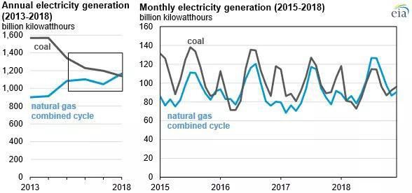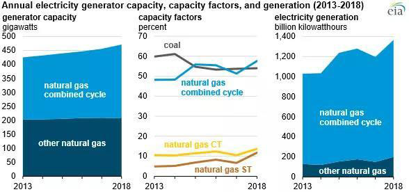 根據(jù)美國(guó)能源信息署的數(shù)據(jù),自2015年初以來(lái),約有40吉瓦的燃煤發(fā)電能力已經(jīng)退役,美國(guó)沒(méi)有新的煤炭產(chǎn)能上線(xiàn)。在同一時(shí)期,美國(guó)天然氣聯(lián)合循環(huán)(NGCC)凈容量增長(zhǎng)了約30吉瓦。截至2019年1月美國(guó)天然氣聯(lián)合循環(huán)電廠(chǎng)裝機(jī)總計(jì)為264吉瓦(GW),而燃煤發(fā)電廠(chǎng)的發(fā)電裝機(jī)為243吉瓦。