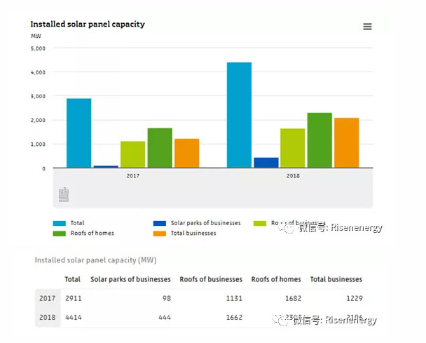 根據(jù)荷蘭中央統(tǒng)計(jì)局(CBS,Centraal Bureau voor de Statistiek)的數(shù)據(jù),荷蘭的太陽(yáng)能裝機(jī)容量在2018年增加了1,500至4,414兆瓦,相比2017年增加了50%以上。其中包括2.3GW的個(gè)人屋頂光伏系統(tǒng)裝機(jī)量、0.44GW的大型太陽(yáng)能電站,以及1.66GW的工商業(yè)屋頂電站系統(tǒng)。