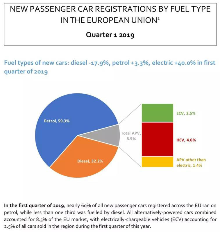 根據(jù)歐洲汽車制造業(yè)協(xié)會(huì)(ACEA)的數(shù)據(jù),2019年第一季度歐盟國家共售出99,174輛(其中全電動(dòng)汽車61,789輛、插電混動(dòng)37,385輛),比2018年第一季度增長40%,但是只占同期歐盟汽車市場(chǎng)的2.5%。汽油車仍在市場(chǎng)占絕對(duì)優(yōu)勢(shì),占比59.3%;柴油車占比32.2%;混動(dòng)車占比4.6%。