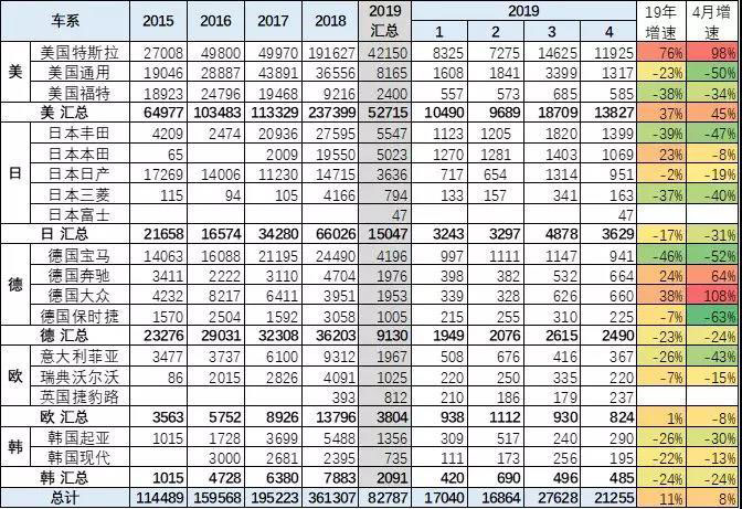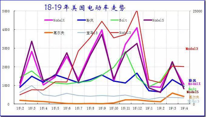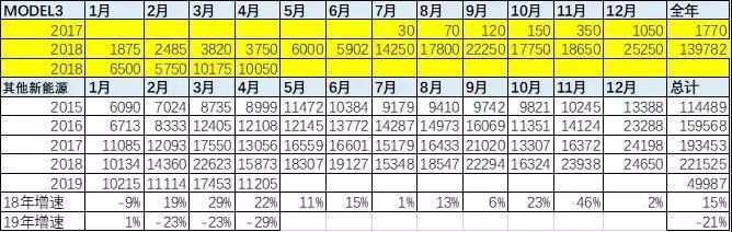 特斯拉MODEL3新品車型一枝獨秀,其他車型增長低迷,但逐步提升。但其他新能源車受到特斯拉影響較小,總體走勢較好,18年3季度沒有持續(xù)下行。18年4季度的增長較猛。19您 1季度低迷,但4月的銷量沒有大幅低于3月,體現(xiàn)市場走穩(wěn)的較好特征。