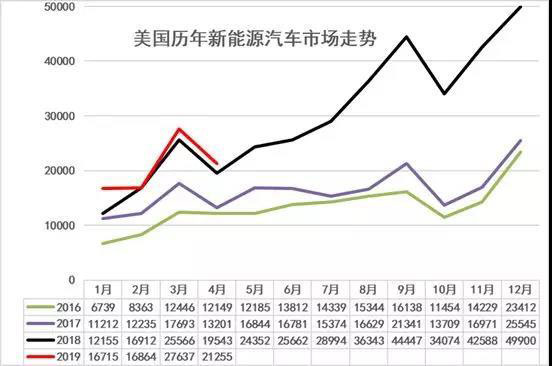 2019年1月與2018年1月市場銷量提升0.45萬臺,增速38%表現(xiàn)總體很好。在2月美國新能源車銷量1.68萬臺,同比零增長。3月美國新能源車同比增長0.2萬臺,同比增速增速4%,相對2月的表現(xiàn)較好。2019年1季度美國新能源車銷量6.1萬臺,同比增速11%。4月美國銷量同比增長。