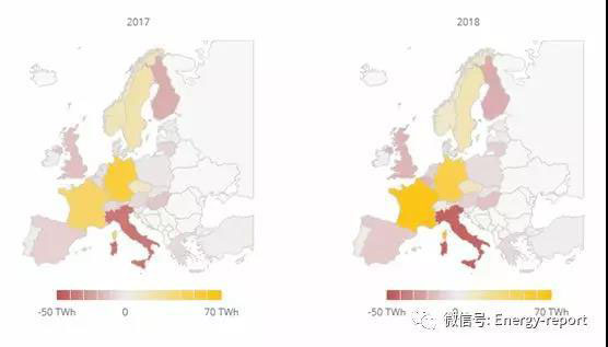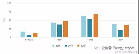 在經(jīng)歷了2017年的極度干旱(發(fā)電量減少)之后,歐洲西南部在2018年恢復(fù)了通常的水力發(fā)電水平。西班牙、葡萄牙、意大利和法國的水電發(fā)電量強(qiáng)勁增長,西班牙和葡萄牙去年的水電發(fā)電量幾乎翻了一番。