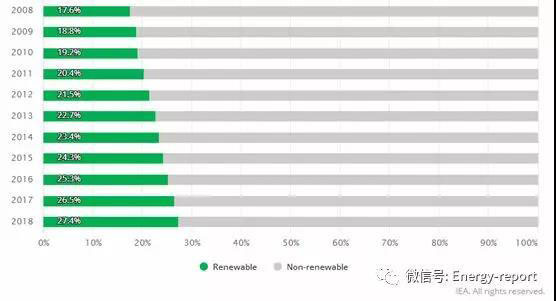 2018年電力部門發(fā)電量增長中,可再生能源發(fā)電占71.8%。自2008年以來,可再生能源在經(jīng)合組織電力結(jié)構(gòu)中的份額持續(xù)增長,增加幅度為9.8%,現(xiàn)已達(dá)到27.4%。