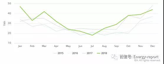 由于風(fēng)流取決于壓力梯度和氣溫,2018年的極端天氣事件影響了風(fēng)力發(fā)電,例如歐洲的夏季熱浪影響,導(dǎo)致7月份大陸發(fā)電量下降,該月發(fā)電量低于2015年同期,即使三年間裝機(jī)容量大幅增加。 1月和3月出現(xiàn)了非常高的發(fā)電高峰。最高和最低月發(fā)電量水平之間的差異是有史以來最高水平之一,最低發(fā)電量僅為最大值的38.3%。