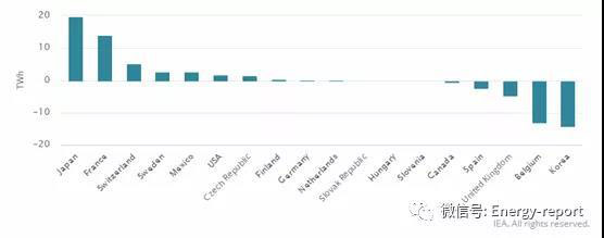 日本的核電發(fā)電量增長得最快(+19.7TWh,+71.0%),2018年又重新啟動(dòng)了4座核電站;和法國(+14.1TWh,+ 3.7%)相比,其核設(shè)施的供應(yīng)量與2017年相比有所提高。瑞士(+5.1TWh,+ 26.1%)和瑞典(+2.7TWh,+4.4%)略有增加)。在瑞士,一個(gè)核電站在2018年初重新啟動(dòng),另一個(gè)核電站的維護(hù)期比2017年更短。就瑞典而言,核電已經(jīng)成為2018年的最大電力來源,超過水電,自2014年以來已經(jīng)成為最重要的電力來源。