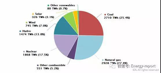 經(jīng)合組織國家凈發(fā)電量同比增長1.9%(+195.2TWh),達(dá)到10682TWh;其中,天然氣增長是主要驅(qū)動(dòng)因素,天然氣增加了156.4 TWh(+5.6%),達(dá)到了2928TWh。煤電發(fā)電量占比繼續(xù)延續(xù)從2014年開始下滑勢(shì)頭,降至2710TWh??傮w而言,與2017年相比,化石燃料對(duì)應(yīng)的發(fā)電量增加了41.4TWh。