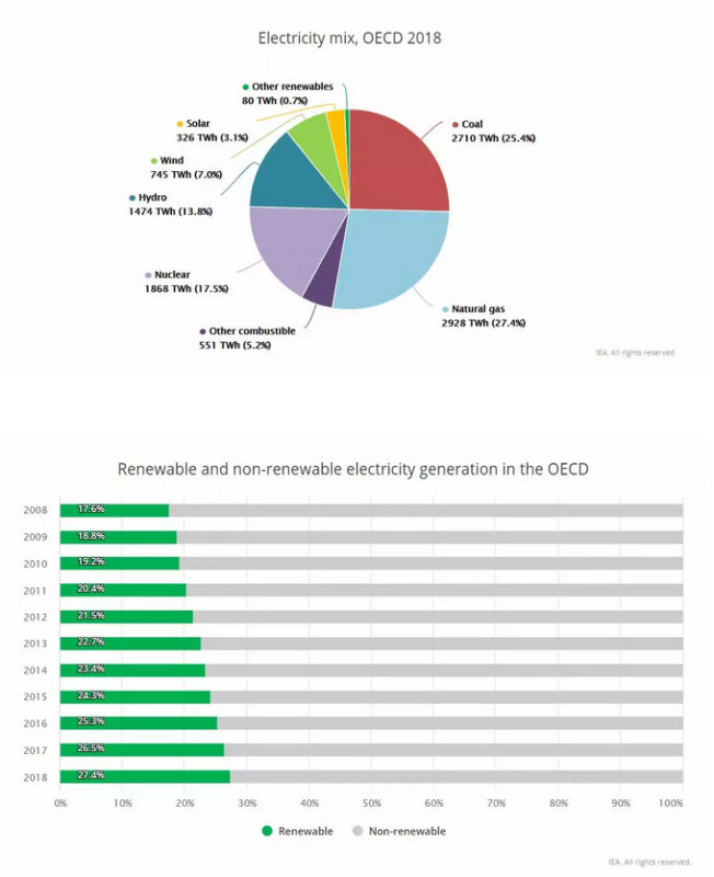 根據(jù)國(guó)際能源署最新數(shù)據(jù),2018年經(jīng)合組織36個(gè)成員國(guó)的發(fā)電結(jié)構(gòu)中天然氣比例最高,達(dá)到27.4%,其次是煤電(25.4%)、核電(17.5%)、水電(13.8%)、風(fēng)電(7.0%)、太陽能(3.1%)、其他燃料電源(5.2%)、其他可再生能源(0.7%)??傮w而言,2018年經(jīng)合組織國(guó)家的可再生能源比例為27.4%,比2008年增長(zhǎng)9.8個(gè)百分點(diǎn);化石能源電源比例為52.8%。