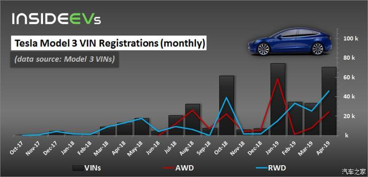 其中,特斯拉Model 3(參數(shù)|詢價(jià))依然是貢獻(xiàn)最大的車型,截止到4月29日,該車型的累計(jì)注冊(cè)數(shù)量超過4萬輛,達(dá)到40732輛;特斯拉總注冊(cè)量達(dá)70880輛,其中北美地區(qū)為最大交付地區(qū),以37754輛占比53.3%,除北美以外的國際地區(qū)交付量達(dá)33126輛,占比46.7%。就四月份而言,后輪驅(qū)動(dòng)相比四驅(qū)車型來說更具吸引力,其中后輪驅(qū)動(dòng)車型交付量達(dá)46403輛,占比65.5%。