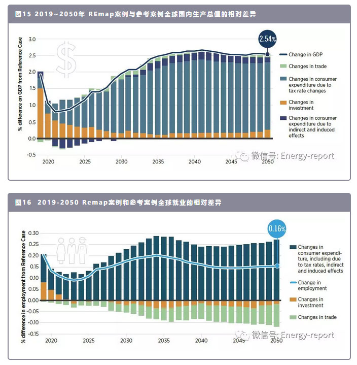 在全球經(jīng)濟(jì)范圍內(nèi),根據(jù)參考案例(Reference)和REmap案例分析的數(shù)據(jù),總體就業(yè)人數(shù)在2018~2050年將持續(xù)增加,復(fù)合年增長(zhǎng)率分別為0.45%和0.46%。REmap案例比參考案例提供更多的就業(yè)崗位,相對(duì)增長(zhǎng)在2035年左右達(dá)到峰值,并在2050年前保持在0.2%左右。
