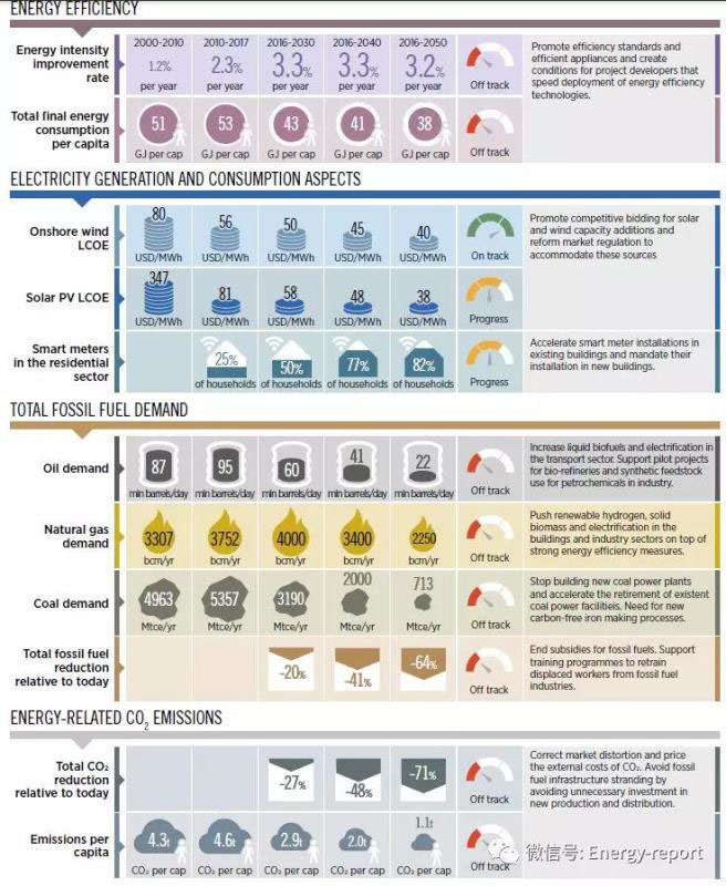 圖2 2050年路線圖:跟蹤關(guān)鍵能源系統(tǒng)指標(biāo)的進(jìn)展情況,以實(shí)現(xiàn)全球能源轉(zhuǎn)型