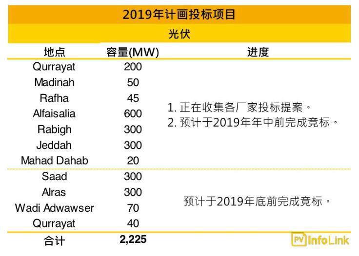 沙特阿拉伯自2017年開始推動再生能源發(fā)展,在國家再生能源計劃Vision2030中,制定2030年前光伏將達(dá)到40GW的累積安裝量,也使得2018-2029年每年約有3.3GW的市場需求。目前光伏市場以電價競標(biāo)PPA刺激需求,并計劃在2019年完成共計2.225GW項目的招標(biāo),其中的1.551GW預(yù)計在2019年上旬完成招標(biāo)。