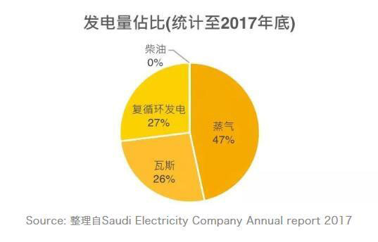 截至2017年底,沙特阿拉伯有將近一半的能源裝機需求來自于蒸汽(47%),其次分別為復(fù)循環(huán)發(fā)電(27%)以及瓦斯(26%),柴油僅占極少數(shù)的比重。而再生能源并未計入發(fā)電來源,其可能原因在于2017年再生能源開始受到政府重視,但當(dāng)時的進(jìn)展多集中在政策研擬及推廣的階段,需求尚未體現(xiàn),因此并未計入發(fā)電來源的項目。