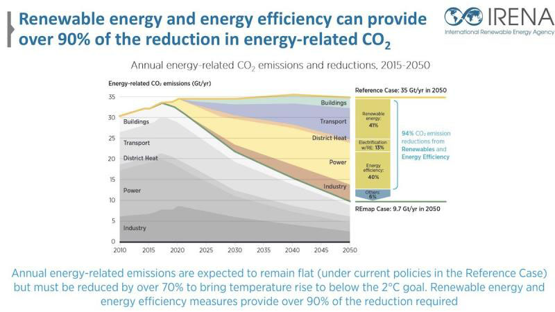 目前,可再生能源提供了全球最終能源消耗總量的六分之一。但隨著可再生能源和電氣化技術(shù)在關(guān)鍵領(lǐng)域的快速普及,IRENA項目的可再生能源可以提供全球所有能源消耗量的三分之二。