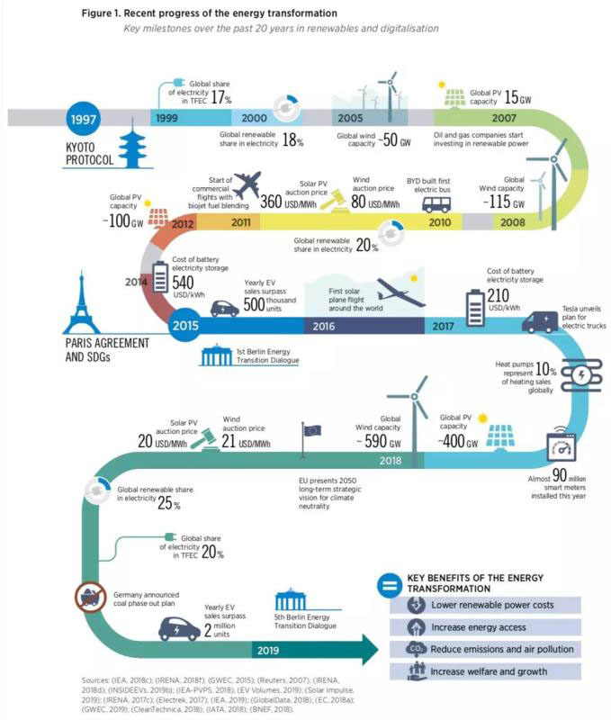 國(guó)際可再生能源署最新發(fā)布的全球能源轉(zhuǎn)型報(bào)告中,包括了這樣一張自1997年京東議定書(shū)簽訂以來(lái)“能源轉(zhuǎn)型路線(xiàn)圖”——
