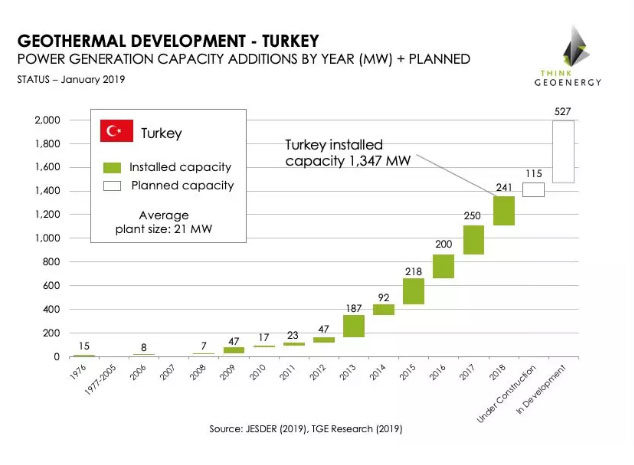 截至2018年底,土耳其共有53座地?zé)岚l(fā)電廠投入運(yùn)營(yíng)。根據(jù)地?zé)犭姀S投資者協(xié)會(huì)的數(shù)據(jù),就裝機(jī)容量而言,土耳其在全球排名第四。擁有5座地?zé)岚l(fā)電廠的Zorlu Enerji能源集團(tuán)(Zorlu Enerji-260 MW、Gurmat Enerji-210 MW、Celikler Enerji-181 MW、Maren Maras Elektrik-149 MW和Turkerler Enerji-78 MW)計(jì)劃在2020年底之前新增50兆瓦的發(fā)電能力。