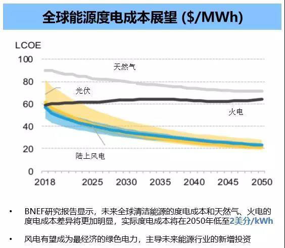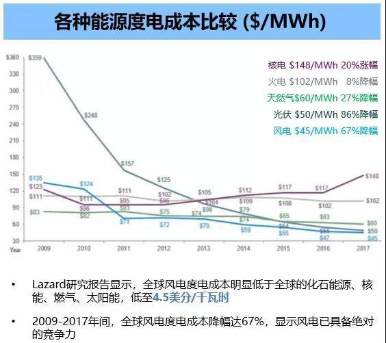 在今年金風(fēng)科技發(fā)布的報(bào)告中,與核電、火電、天燃?xì)狻⒐夥饶茉葱问较啾?,風(fēng)電的度電成本已經(jīng)極具競爭力。截至2017年,全球風(fēng)電度電成本已經(jīng)低至4.5美分/千瓦時(shí)(折合人民幣0.30元/千瓦時(shí)),已具備絕對的競爭力,并有望在2050年達(dá)到2美分/千瓦時(shí)(折合人民幣0.13元/千瓦時(shí))。